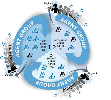 Often called Agent groups, these groups are found in offices that handle high-volume customer calls from customers who do not need a specific person's help, but instead require the assistance of several people, such as sales representatives and airline reservation attendants. Agent groups have many features.